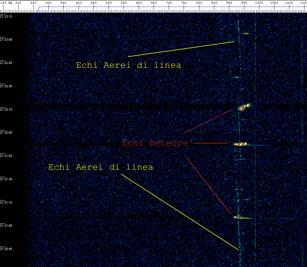 Come potete vedere dalle immagini, i segnali degli aerei, hanno uno spostamento di frequenza lento e continuo, mentre le stelle cadenti, essendo molto più veloci, emettono un rapido picco di segnale.