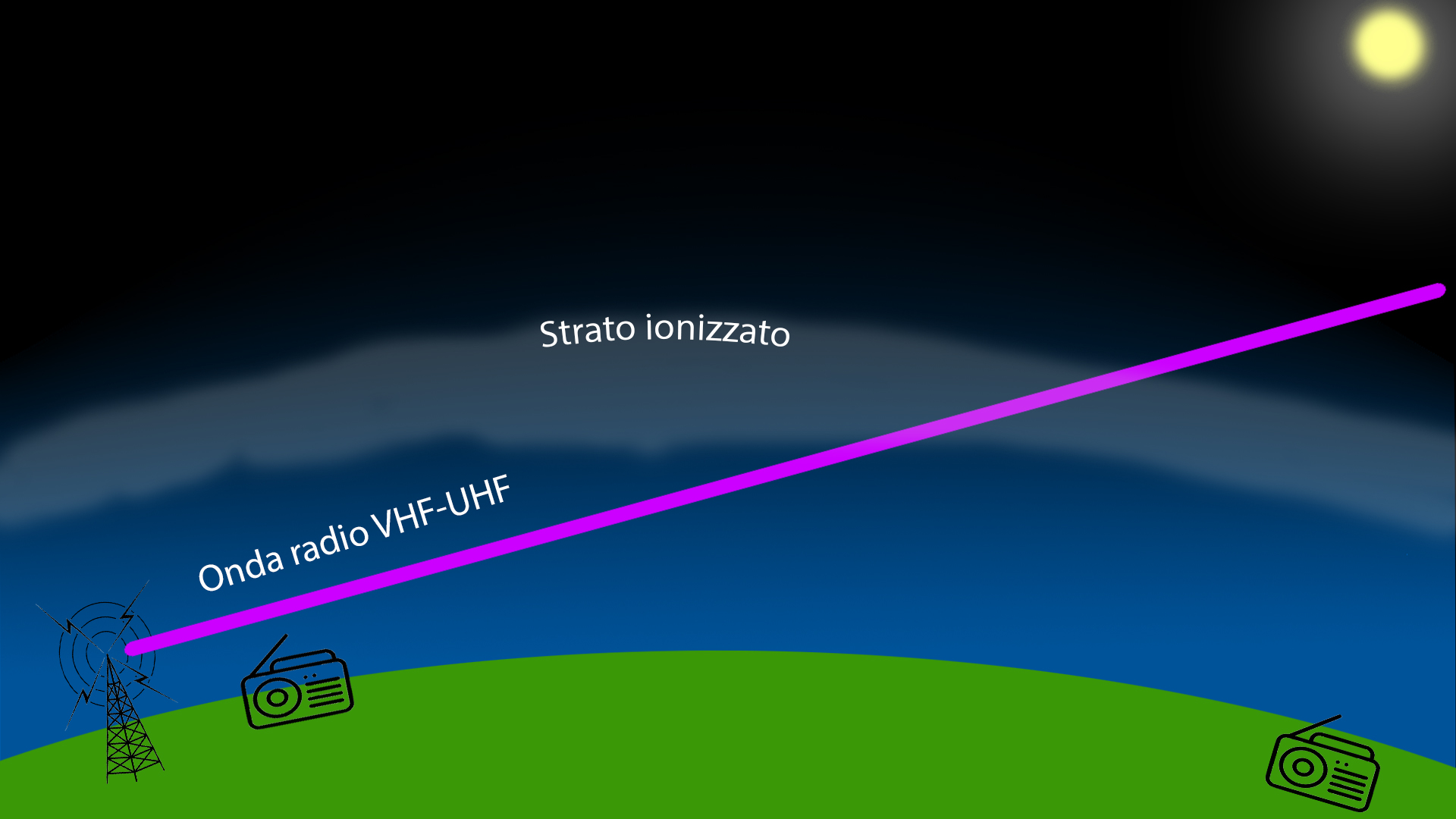 La nostra stazione radio, trasmette da terra un segnale da 0 a 30 MHz, esso viaggia per l’atmosfera senza seguire la curvatura terrestre e quindi tendendo verso lo spazio esterno.