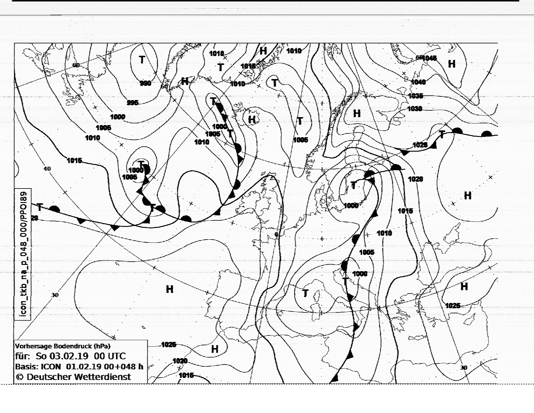 Questa è la previsione a 48 ore della pressione al suolo per l’Europa, stazione DDK3 di Amburgo.