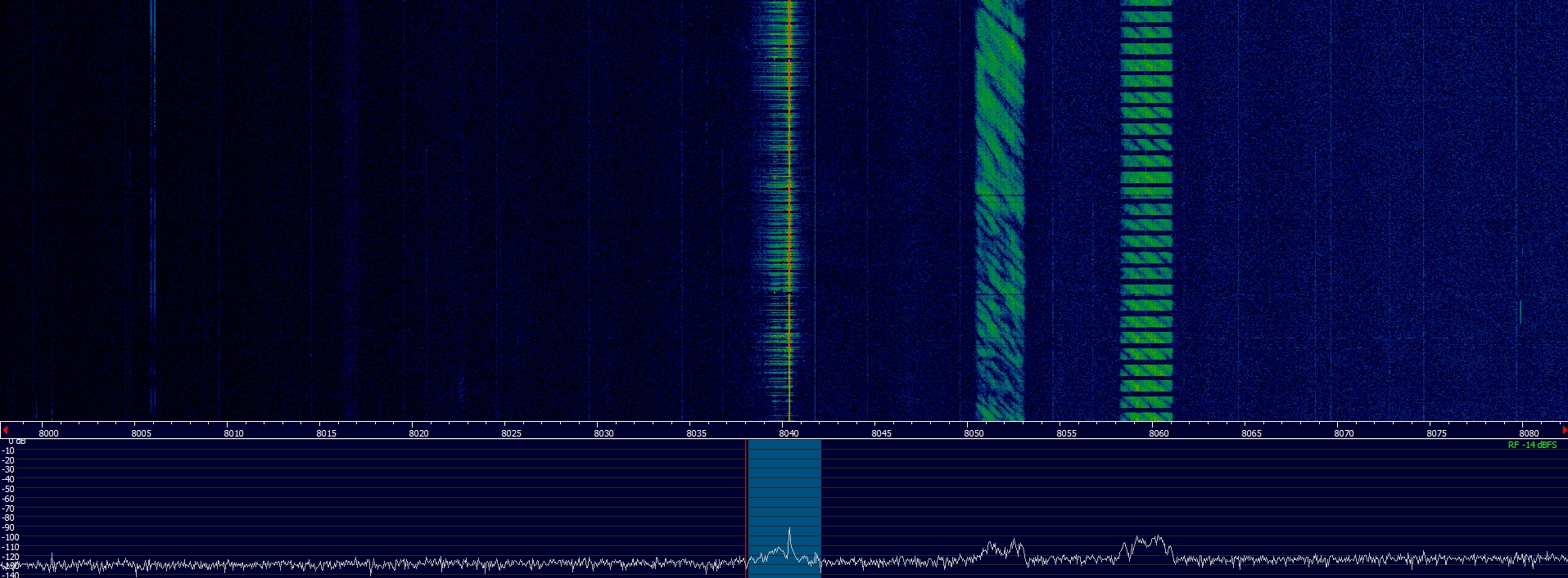 Mi sono quindi sintonizzato su due stazioni ben ricevibili dall’Italia, ovvero 7878.1 kHz DDK3 (Amburgo, Germania) e 8038 kHz GYA (Northwood U.K.)
